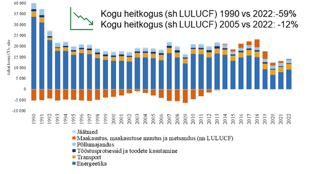 Joonisel 3 on näha KHG heitkoguste muutused 1990. aastast kuni 2022. aastani, tuues välja olulised arengusuunad eri sektorites. Selle põhjal saab lahti seletada kaks peamist teemat.